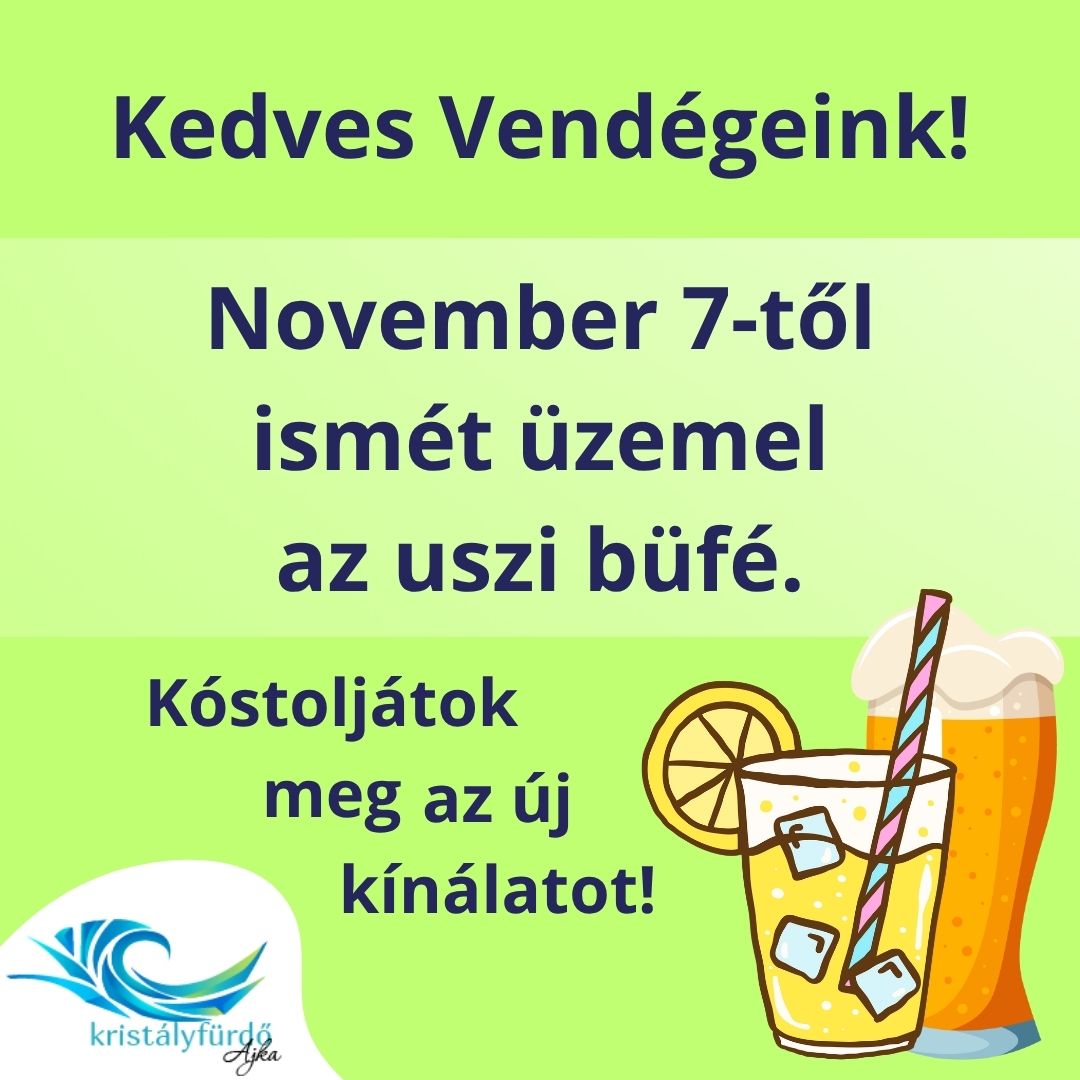 Jó hírünk van! November 7-től ismét üzemel a büfé az uszodában! Gyertek és frissüljetek fel úszás vagy szauna után!Várunk mindenkit szeretettel