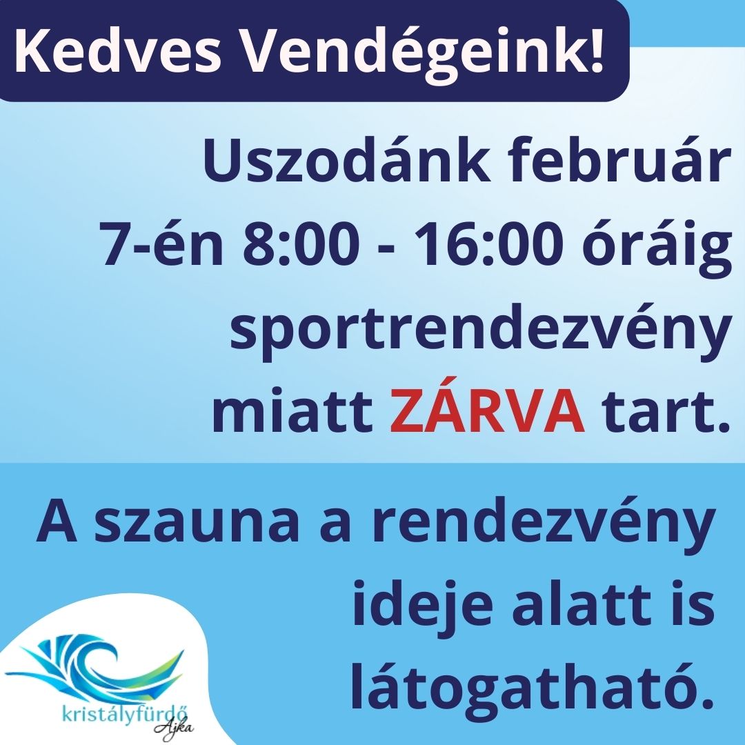 Kedves Vendégeink! Uszodánkban február 7-én 8:00 – 16:00 óra között sportrendezvény lesz, emiatt a medencék csak 16:00 órától használhatók. A szauna a rendezvény ideje alatt
